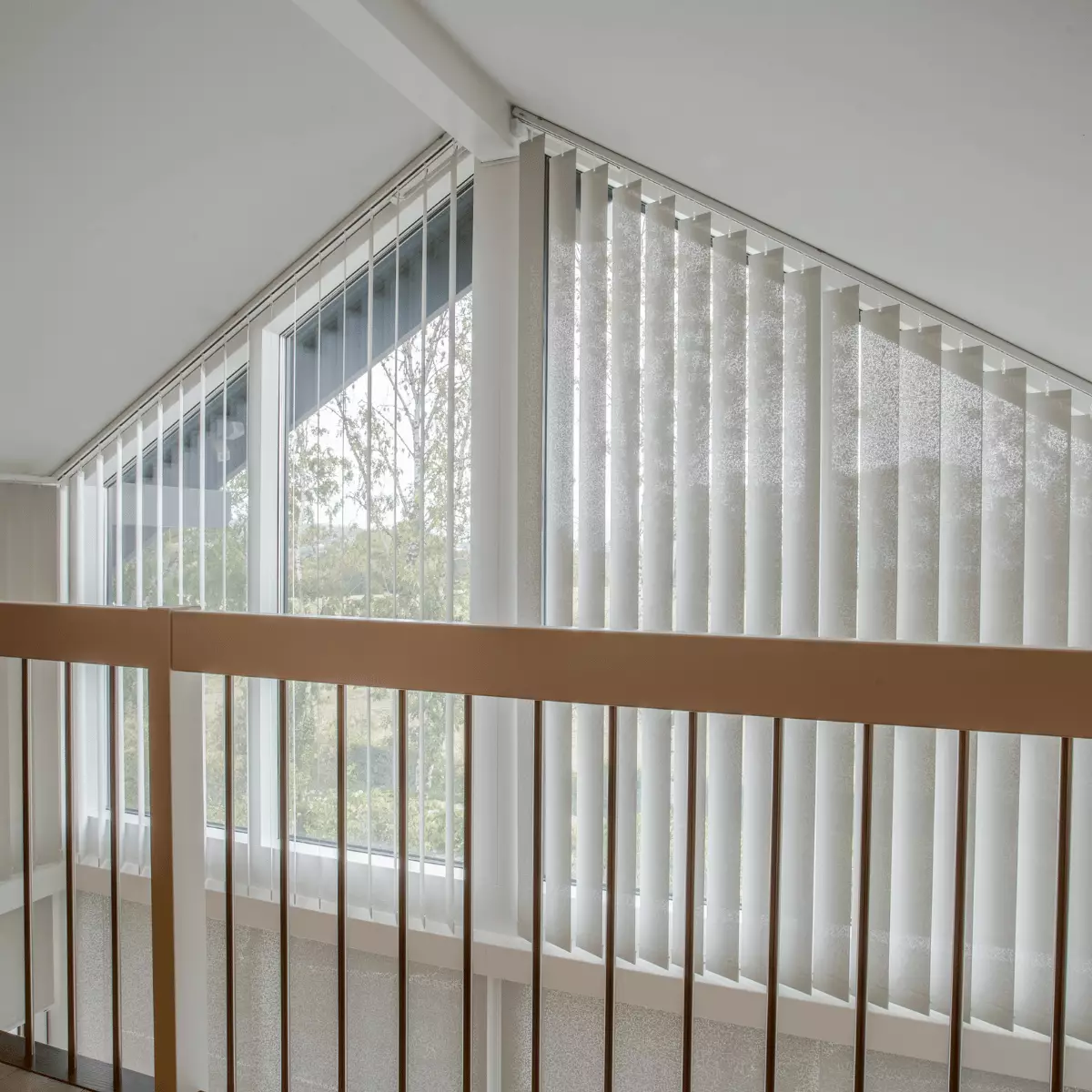 Exemple d’usage : Grande baie vitrée dans un escalier cathédrale ? Le store californien trapèze épouse la pente à la perfection !